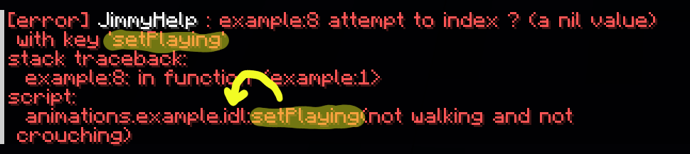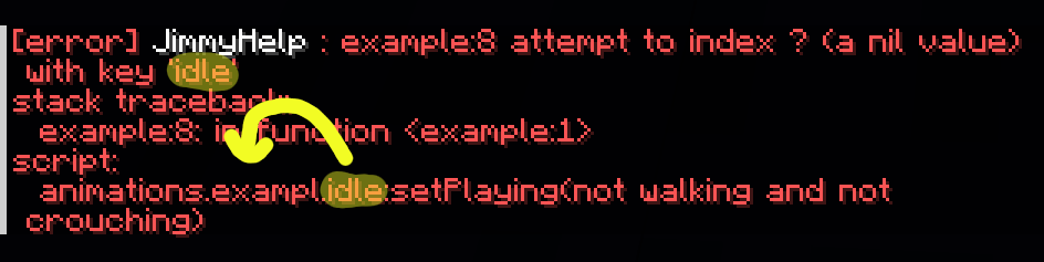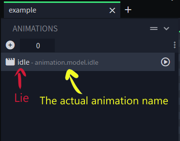 The next part of the index is always the Blockbench model name that contains the animation you want to play, in our case this is example.bbmodel (if your Blockbench model is in a subfolder, that will need to be included as well like animations["subfolder.example"].idle)